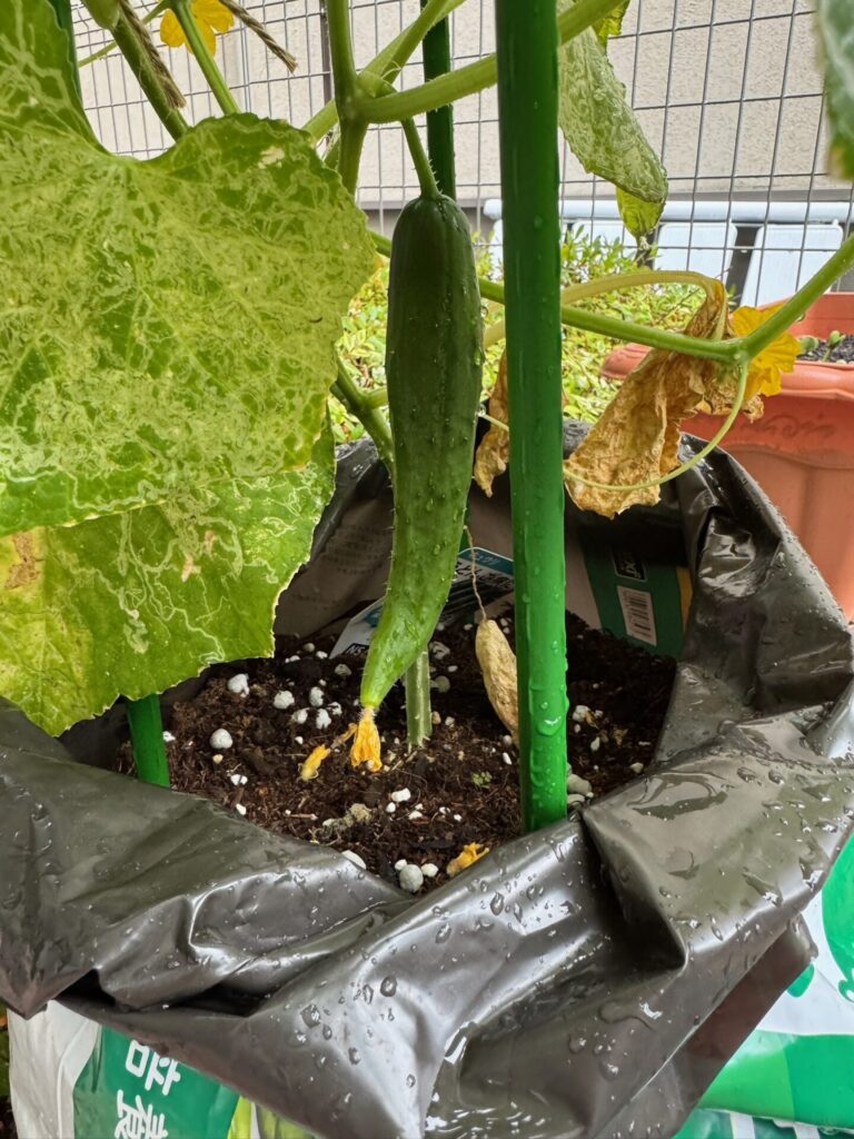 きゅうりを育てて驚くのは、その圧倒的な成長スピードです。 実がつき始めると、朝は5cmだったものが、仕事から帰ってきた夜には10cmを超え、翌朝にはもう収穫サイズ……なんてことがザラにあります。